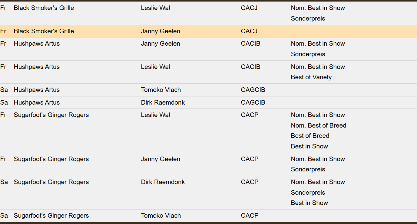 2 x CACP ,2 x Rassesieg, 2 x nom. zur BIS und konnte die BIS für sich entscheiden.